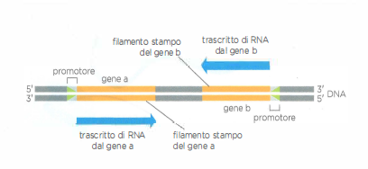 Su un solo cromosoma, alcuni geni sono trascritti usando come stampo un filamento di DNA, altri geni usando invece l’altro filamento di DNA. L’RNA polimerasi si sposta sempre in direzione 3′→5′ rispetto al filamento stampo di DNA. La polarità del promotore, posto all’inizio di ogni gene, determina quale filamento funge da stampo (punte di freccia verdi). In questo disegno il gene a, che viene trascritto da sinistra a destra, usa come stampo il filamento inferiore (Figura 7.10): il gene b, trascritto da destra a sinistra, usa come stampo il filamento superiore.