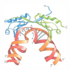 La proteina che si lega alla TATA box (TBP) stabilisce un legame con le sequenze TATA (indicate con le lettere) e distorce la doppia elica di DNA. La TBP, una subunità del TFIID (Figura 7.12), distorce il DNA quando vi si lega. La TBP è una catena polipeptidica unica ripiegata in due domini molto simili (blu e verde). La proteina si posiziona sopra la doppia elica come la sella sulla groppa di un cavallo.