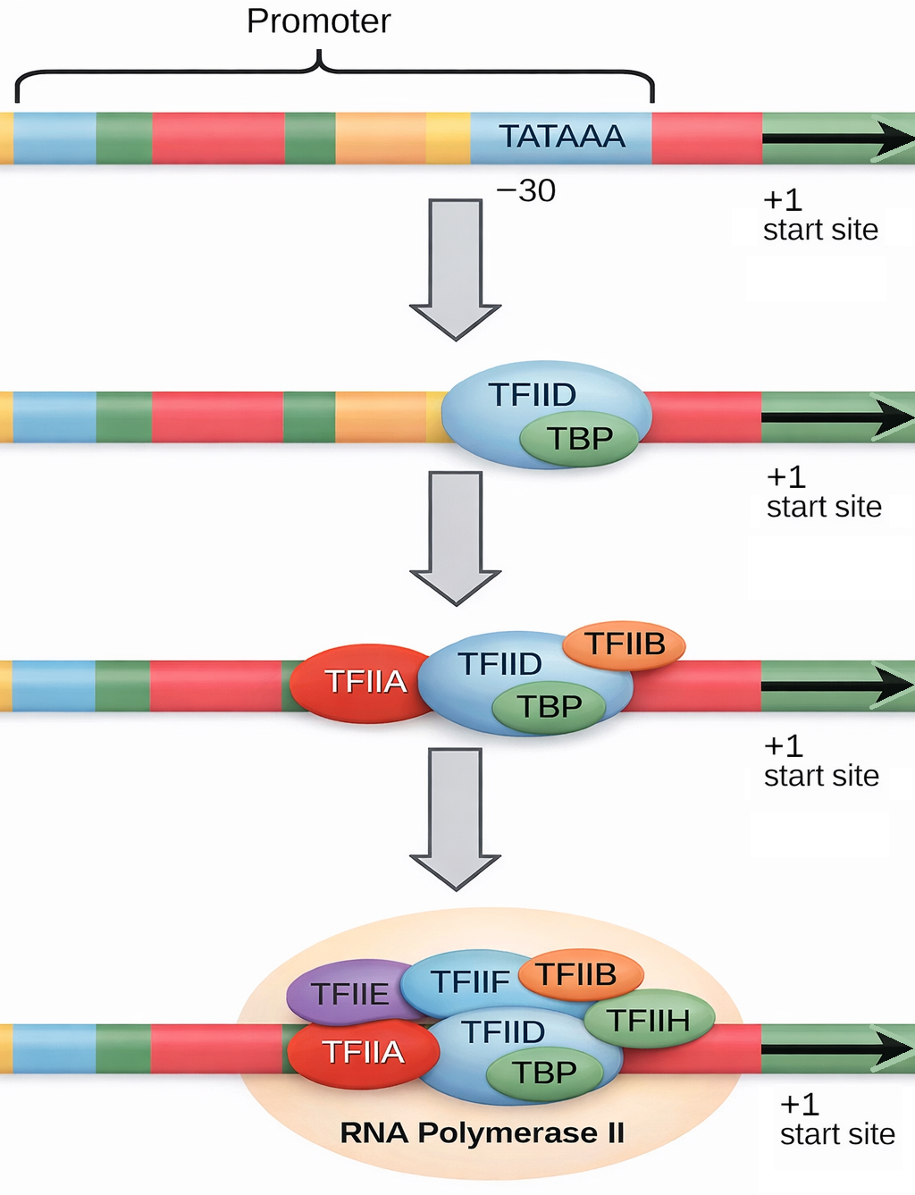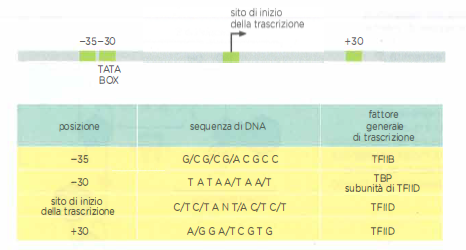 Negli eucarioti i promotori dei geni contengono sequenze che promuovono il legame dei fattori generali di trascrizione. Sono indicate le posizioni di ciascuna sequenza e i fattori generali di trascrizione che le riconoscono. N indica qualsiasi nucleotide e la barra (/) significa che entrambi i nucleotidi possono essere presenti nella posizione indicata. Per la maggior parte dei siti di inizio trascritti dall’RNA polimerasi II sono necessarie solo due o tre delle quattro sequenze. Sebbene la maggior parte di queste sequenze di DNA si trovi a monte del sito di inizio della trascrizione, una, a +30, si trova all’interno della regione trascritta del gene.