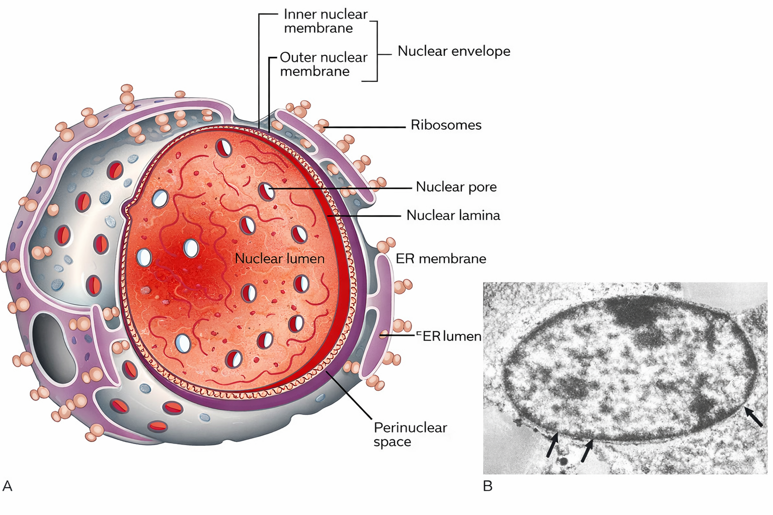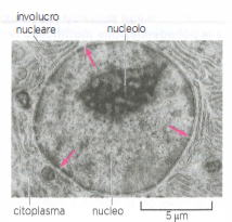 Per essere tradotte, le molecole di mRNA sintetizzate nel nucleo devono essere esportate nel citoplasma attraverso i pori dell’involucro nucleare (frecce rosse). In questa immagine appare il nucleo di una cellula di fegato in sezione. Il nucleolo è il luogo in cui gli RNA ribosomiali vengono sintetizzati e associati alle proteine per formare i ribosomi, che vengono successivamente esportati nel citoplasma.