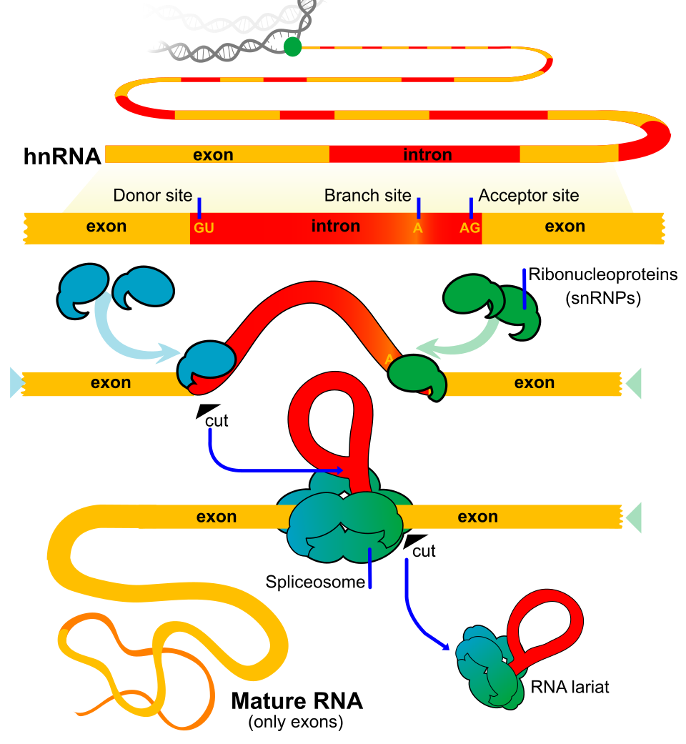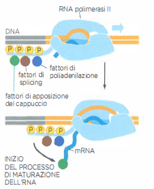 Il trascritto primario prodotto dall’RNA polimerasi II (pre-mRNA) include sia esoni sia introni. Dopo il capping, e mentre la trascrizione procede, si attiva lo splicing, processo di taglio e giunzione che elimina gli introni e ricuce gli esoni in continuità. La poliadenilazione del 3′ avviene al termine o, in molti casi, in parallelo alle reazioni di splicing. Il risultato finale, un mRNA con cappuccio 5′, giunzioni esone–esone e coda poli(A), è competente per l’export e la traduzione.