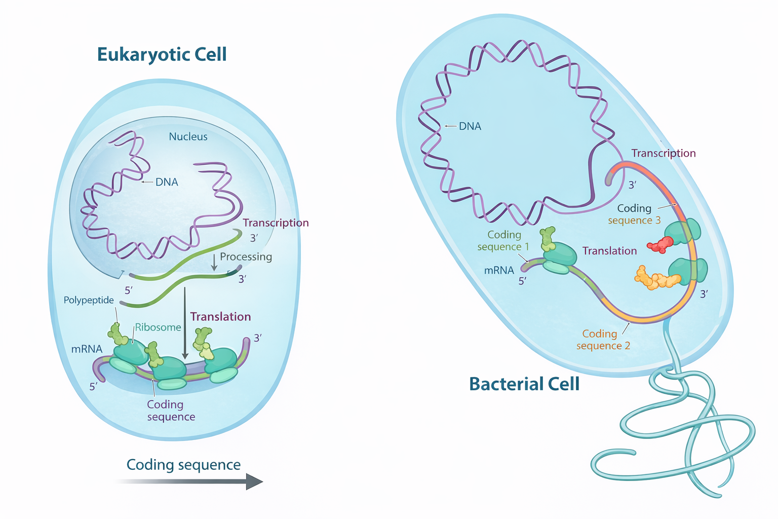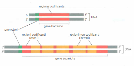 I geni sono organizzati in modo diverso nei procarioti e negli eucarioti. Il gene batterico consiste di un tratto unico di sequenza nucleotidica ininterrotta, che codifica la sequenza amminoacidica di una proteina. Invece, le sequenze codificanti di quasi tutti i geni degli eucarioti (esoni) sono interrotte da sequenze non codificanti (introni). I promotori della trascrizione sono indicati in verde.