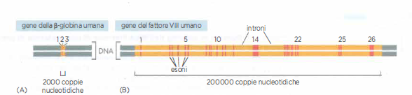 La maggior parte dei geni umani codificanti è frammentata in esoni e introni. (A) Il gene della β-globina, che codifica una delle subunità dell’emoglobina, proteina vettrice di ossigeno, contiene 3 esoni. (B) Il gene che codifica il fattore VIII, una proteina attiva nel processo della coagulazione sanguigna, contiene 26 esoni. Alcune mutazioni in questo grande gene causano la forma più comune di emofilia.