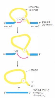 Durante lo splicing dell’RNA l’introne di una molecola di pre-mRNA forma una struttura ramificata. Nella prima tappa il residuo di adenina della biforcazione a cappio (A rossa), situato nella sequenza intronica, attacca il sito di splicing al 5′ e taglia l’ossatura zucchero-fosfato dell’RNA in quel punto (la stessa A evidenziata in rosso nella Figura 7.20). In questo processo, al punto di taglio al 5′ l’introne stabilisce un legame covalente con il gruppo 2′-OH del ribosio che porta quella adenina, formando una struttura a cappio. L’estremità libera 3′-OH della sequenza esonica reagisce poi con l’estremità iniziale della sequenza esonica successiva, unendo i due esoni in una sequenza codificante continua e liberando la struttura a cappio che contiene l’introne, destinata a essere degradata nel nucleo.