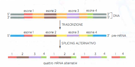Alcuni pre-mRNA vengono sottoposti a uno splicing alternativo in modo tale da produrre diversi mRNA e proteine a partire dallo stesso gene. Sebbene tutti gli esoni siano trascritti, lo spliceosoma può saltarne alcuni per produrre mRNA diversi, dando luogo a splicing alternativi, come mostrato. Questo salto si verifica quando i segnali di splicing all’estremità 5′ di un introne vengono appaiati con il punto di diramazione e con l’estremità 3′ di un introne diverso. Una caratteristica importante dello splicing alternativo è che gli esoni possono essere saltati o inclusi; tuttavia, il loro ordine, che è specificato nella sequenza del DNA, non può essere riorganizzato.