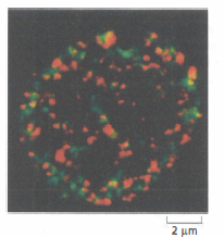 Gli RNA sono prodotti da fabbriche presenti nel nucleo. Gli RNA vengono sintetizzati ed elaborati (in rosso) e il DNA viene replicato (in verde) nei condensati intracellulari che formano compartimenti discreti all’interno di un nucleo di mammifero. In questa micrografia, questi aggregati di proteine e acido nucleico sono stati visualizzati rilevando DNA e RNA di nuova sintesi. In alcuni casi, replicazione e trascrizione avvengono nello stesso sito (in giallo).