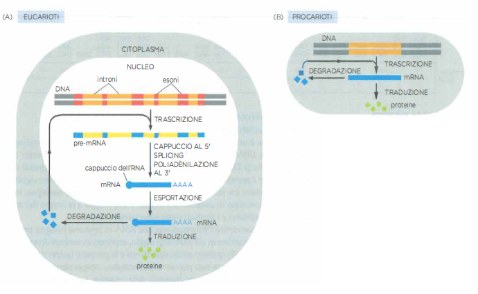 La produzione di molecole di mRNA è molto più complessa negli eucarioti che nei procarioti. (A) Nelle cellule eucariote la molecola di pre-mRNA prodotta nella trascrizione contiene sequenze sia esoniche sia introniche. Le due estremità sono modificate dall’aggiunta del cappuccio e dalla poliadenilazione e gli introni vengono rimossi tramite splicing. L’mRNA risultante si trasferisce quindi dal nucleo al citoplasma, dove avviene la traduzione in proteina. I vari stadi sono indicati come se avvenissero uno dopo l’altro, in sequenza, ma in realtà essi si verificano simultaneamente. Per esempio, viene aggiunto il cappuccio e comincia il procedimento di taglio e ricucitura prima che la trascrizione sia completa: a causa di queste sovrapposizioni di solito non si trovano nella cellula trascritti dell’intero gene (cioè comprensivi di tutti gli introni e gli esoni). Alla fine, gli mRNA vengono degradati da RNasi nel citoplasma e i nucleotidi di cui erano costituiti vengono riutilizzati per la trascrizione. (B) Nei procarioti la produzione di molecole di mRNA è più semplice. L’estremità 5′ di una molecola di messaggero nasce all’inizio della trascrizione a opera dell’RNA polimerasi e l’estremità 3′ si produce con la fine della trascrizione stessa. Dato che le cellule procariote non hanno nucleo, la trascrizione e la traduzione avvengono nello stesso comparto. La traduzione dell’mRNA procariote, quindi, può cominciare prima che la sintesi sia terminata. Sia negli eucarioti sia nei procarioti, la quantità di una proteina nella cellula dipende dall’efficienza di ciascuno di questi processi e dalla velocità con cui si degradano l’RNA e le molecole proteiche.