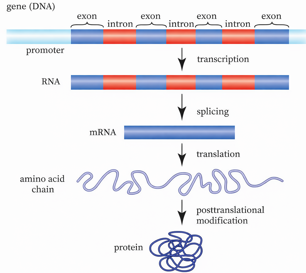 Con espressione genica si intende, in senso ampio, l’insieme dei passaggi mediante i quali l’informazione codificata nel DNA viene convertita in un prodotto funzionale che esercita un effetto fenotipico sulla cellula o sull’organismo. Se il prodotto è una proteina, il processo include trascrizione e traduzione; se il prodotto è un RNA funzionale, la via si arresta alla trascrizione e all’eventuale maturazione dell’RNA stesso.