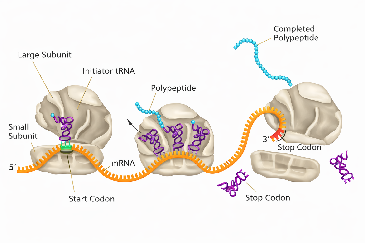 Nei sistemi eucariotici, il principio generale è conservato, ma l’architettura molecolare è più articolata: coesistono tre RNA polimerasi nucleari principali (I, II e III), ciascuna specializzata per specifiche categorie di geni; il riconoscimento del promotore da parte della RNA polimerasi II richiede fattori generali della trascrizione (per esempio il complesso TFIID, che include la proteina legante la TATA box, TBP), e l’accesso al DNA è modulato dalla cromatina e dalle modificazioni degli istoni. Pur non entrando nel dettaglio eucariotico, questa complessità riflette la necessità di un controllo multilivello nell’iniziazione e nella terminazione della trascrizione.