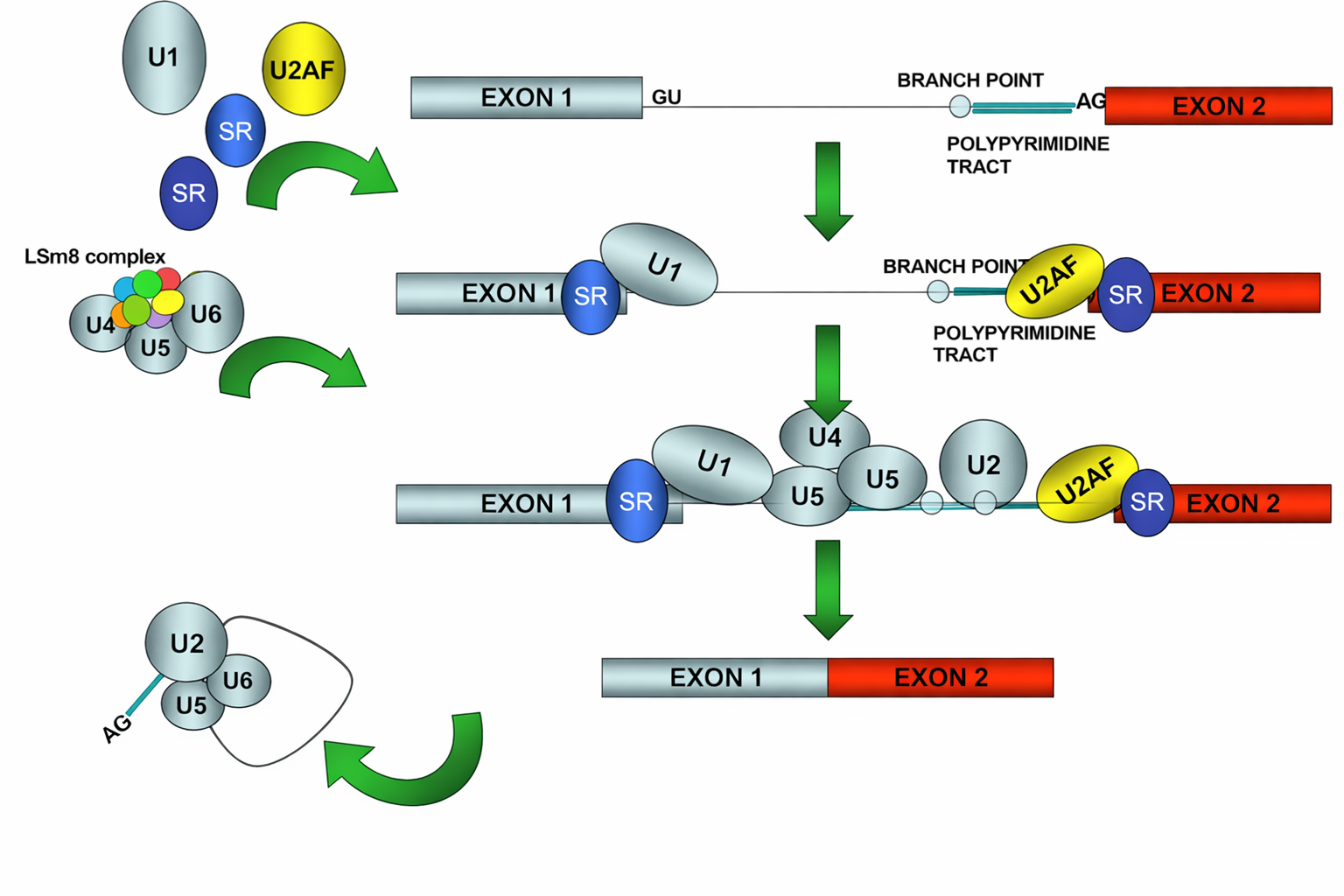 Queste reazioni sono catalizzate in gran parte da RNA, non da proteine. Piccoli RNA nucleari (snRNA) — tra cui U1, U2, U4, U5 e U6 — assemblati con proteine formano le particelle snRNP, che riconoscono per appaiamento di basi i segnali di splicing sul pre-mRNA, orchestrano i riarrangiamenti conformazionali e promuovono la catalisi; gli RNA catalitici coinvolti rientrano nella categoria dei ribozimi (Figura 03.05-21). Le snRNP e numerose proteine accessorie costituiscono lo spliceosoma, un grande complesso dinamico responsabile della rimozione degli introni e della giunzione esonica.