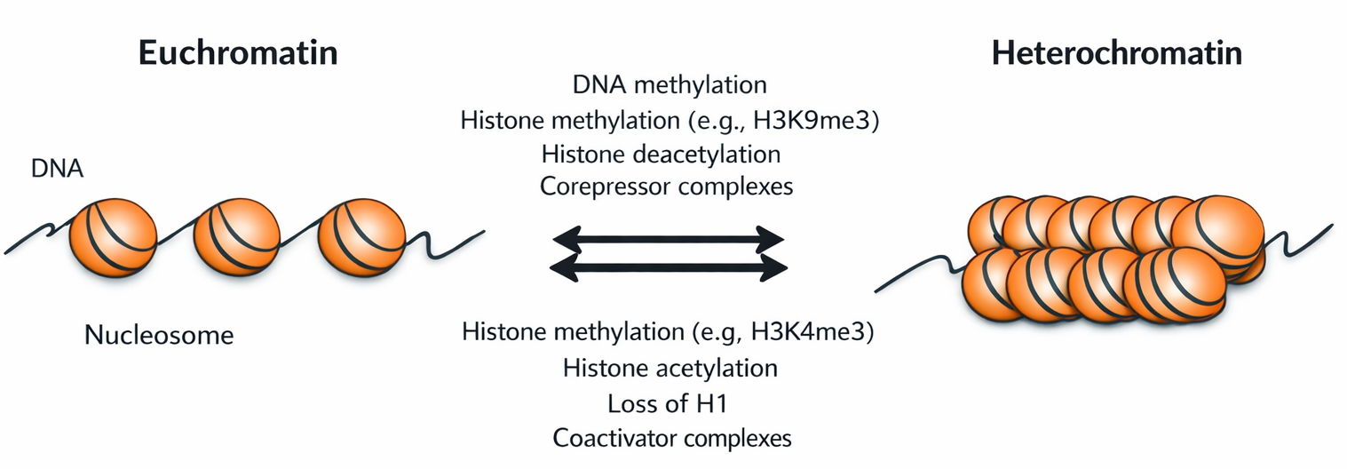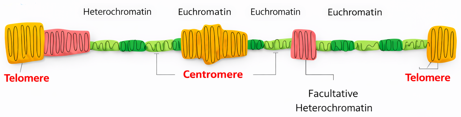La forma più compatta di cromatina interfasica è l’eterocromatina, individuata storicamente come porzioni intensamente colorabili al microscopio ottico. Nei mammiferi, essa rappresenta approssimativamente il 10% della cromatina in interfase e si accumula soprattutto in prossimità di centromeri e telomeri (Figura 02.04-07). La rimanente parte è definita eucromatina, più accessibile in media, benché sia oggi evidente che sia eterocromatina sia eucromatina corrispondano in realtà a insiemi compositi di stati cromatinici con gradi intermedi di compattazione (Figura 02.04-03).