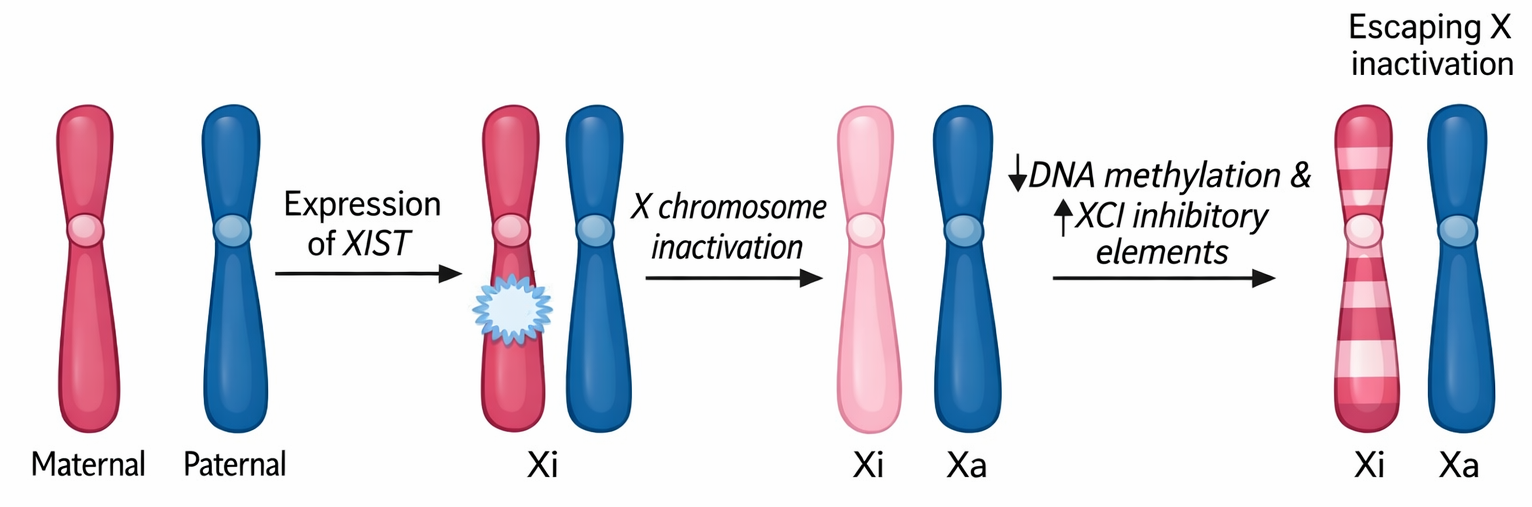 Un caso paradigmatico di silenziamento cromatinico stabile su vasta scala è l’inattivazione del cromosoma X nelle femmine dei mammiferi. Poiché le cellule femminili possiedono due cromosomi X e quelle maschili un X e un Y, è necessario un meccanismo di compensazione del dosaggio: in ciascuna cellula femminile, in fase precoce dello sviluppo embrionale, uno dei due cromosomi X viene selezionato in modo stocastico e convertito in un’unità eterocromatinica in gran parte trascrizionalmente inattiva, nota anche come corpo di Barr. Questo stato si mantiene nelle linee cellulari discendenti (Figura 02.04-05). Il fenomeno produce mosaici di espressione genica X-linked, visibili anche a livello fenotipico in vari organismi; un esempio classico è la pigmentazione a chiazze dei gatti calico, dovuta all’inattivazione differenziale dell’X nei melanociti (Figura 02.04-06). A livello molecolare, l’RNA lungo non codificante Xist riveste il cromosoma destinato all’inattivazione e guida il reclutamento di complessi repressivi e di modificatori istonici, tra cui marcature come H3K27me3 e macroH2A, che contribuiscono alla compattazione e al silenziamento.