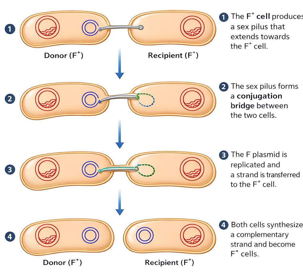 - coniugazione, passaggio diretto di DNA da cellula a cellula mediato da plasmidi o elementi integrativi (Figura 04.02-14);