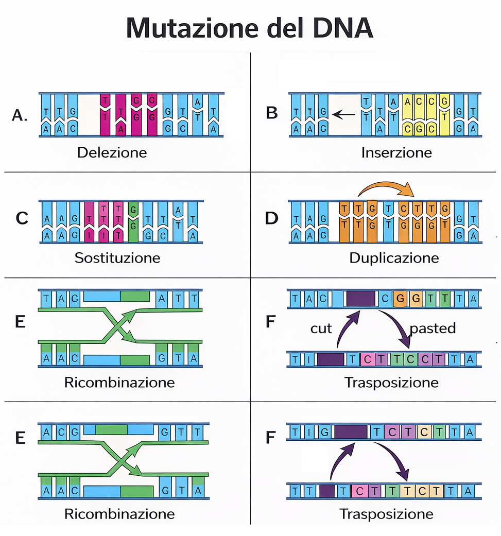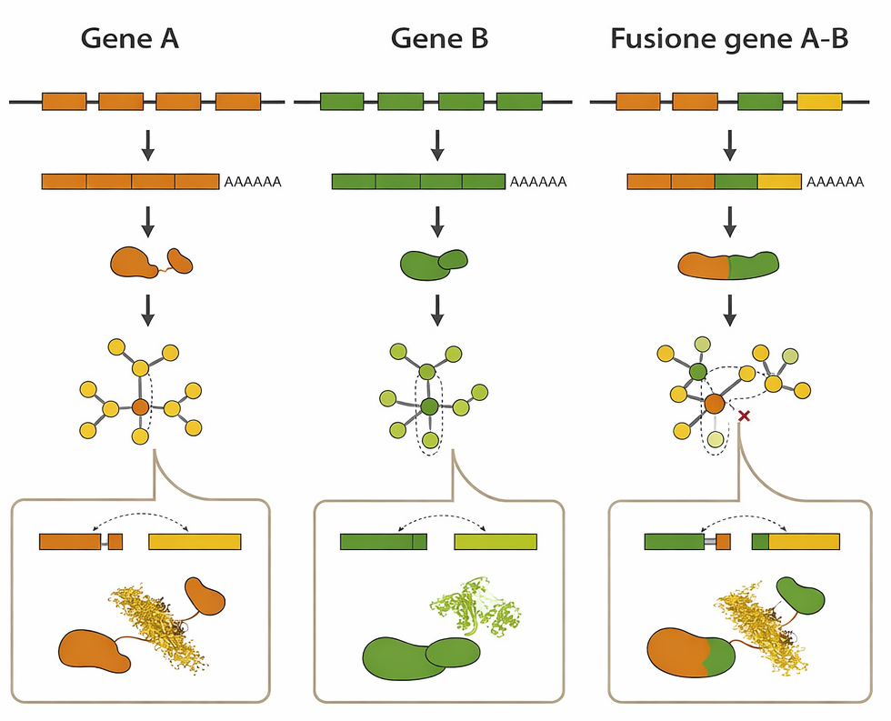 - mutazioni intrageniche: un gene esistente può essere alterato da sostituzioni di singoli nucleotidi, da inserzioni o delezioni di varia estensione oppure da micro-riarrangiamenti locali; tali eventi possono modificare lo splicing, influenzare la stabilità dell’RNA, alterare la struttura o la localizzazione subcellulare della proteina, o incidere sulle sue interazioni molecolari;