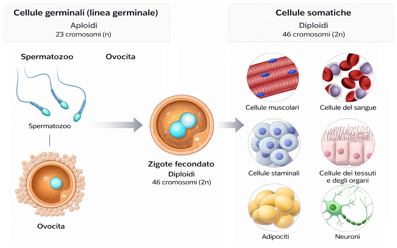 Ognuna di queste sorgenti di variazione ha contribuito all’evoluzione dei genomi attuali e continua a operare. La trasmissione del cambiamento, tuttavia, dipende dal contesto riproduttivo: nelle specie a fecondazione sessuata soltanto una parte delle cellule può veicolare le novità alle generazioni successive. Prima di analizzare in dettaglio i meccanismi di modifica del DNA e le loro conseguenze evolutive, è opportuno chiarire come la riproduzione sessuale condizioni l’ereditarietà delle varianti.
