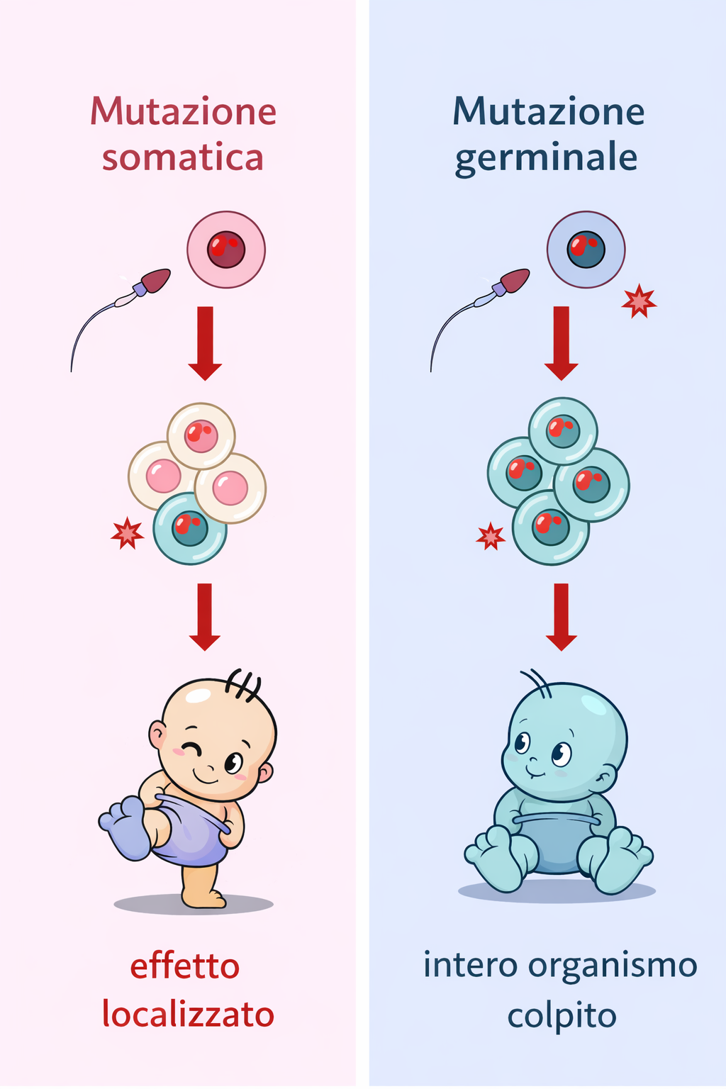 Ne consegue che una mutazione insorta in una cellula somatica, sebbene possa influire sulla salute dell’individuo, per esempio predisponendo all’insorgenza di neoplasie, non viene ereditata dalla sua prole. Perché una variante genetica contribuisca all’evoluzione di una popolazione, deve comparire in una cellula della linea germinale o in una cellula progenitrice dei gameti e raggiungere il gamete che parteciperà alla fecondazione (Figura 04.02-03). Questo principio, spesso indicato come “barriera di Weismann”, è particolarmente netto in molti animali; in altri gruppi, come numerose piante in cui la linea germinale si definisce tardivamente, possono verificarsi eccezioni locali, ma l’ereditarietà rimane legata ai gameti prodotti.