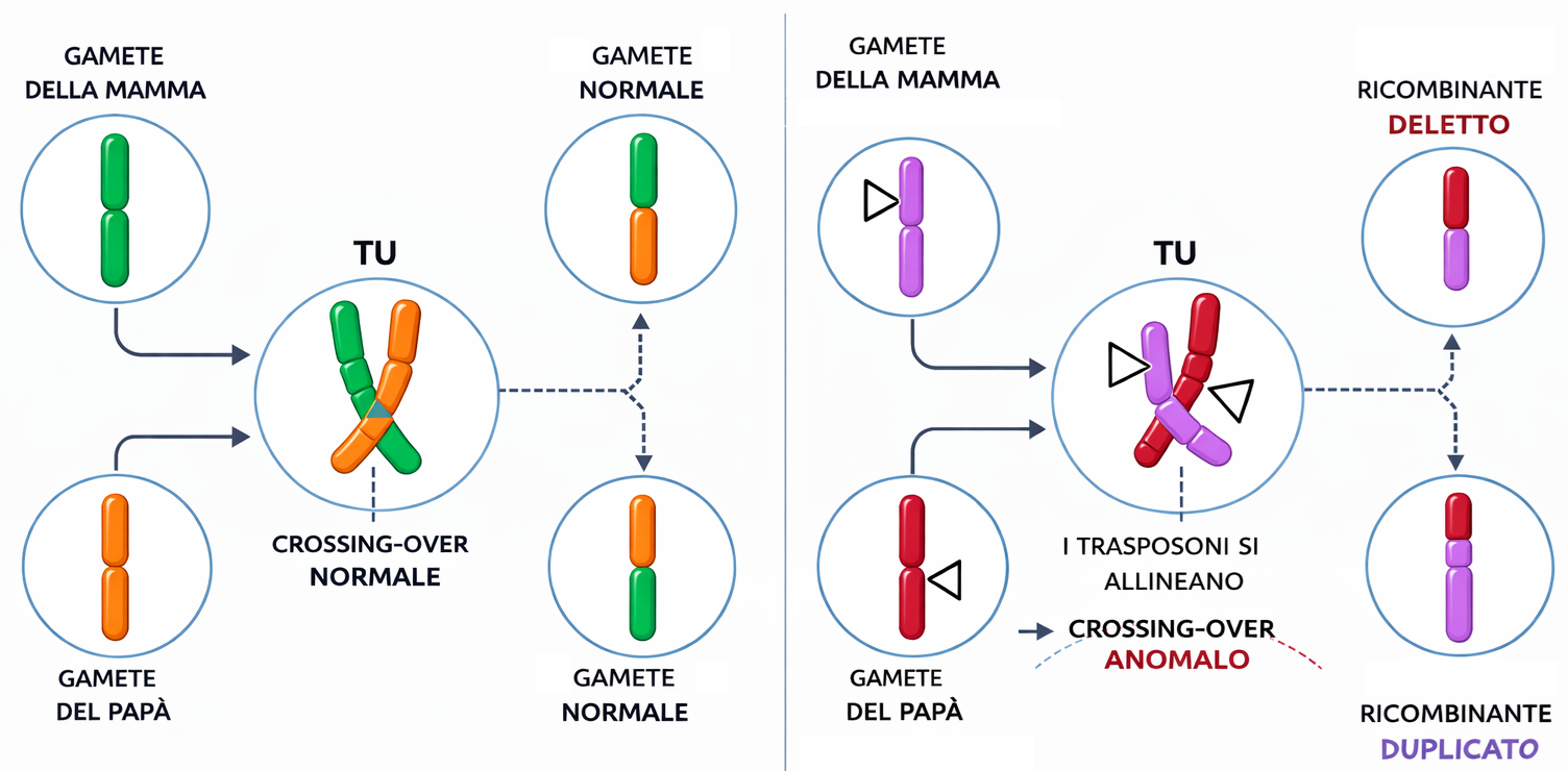 Gli elementi mobili, oltre a inserire nuove sequenze, forniscono substrati di ricombinazione omologa non allelica disseminati nel genoma. Ectopiche ricombinazioni tra copie dello stesso elemento possono generare duplicazioni, delezioni e traslocazioni (Figura 04.02-07). È plausibile che alcune espansioni dei cluster della β-globina siano originate per ricombinazione tra elementi mobili abbondanti nel genoma umano. Dal punto di vista meccanicistico, si distinguono retrotrasposoni (classe I), che si muovono tramite RNA intermedio, e trasposoni a DNA (classe II), che si spostano direttamente come DNA; entrambi hanno lasciato un’impronta estesa nella nostra specie.