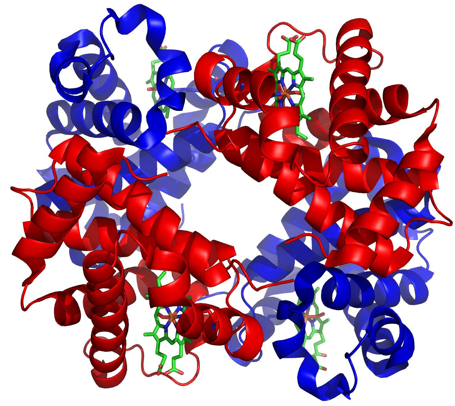Nei mammiferi e nella maggior parte dei vertebrati, la funzione di trasporto dell’ossigeno è affidata a un tetramero α₂β₂ (Figura 04.02-08). I quattro siti di legame cooperano allostericamente: il passaggio tra stati conformazionali a bassa e alta affinità consente un’associazione e un rilascio dell’ossigeno altamente efficienti, irraggiungibili per una globina monomerica. Questa cooperatività è cruciale per organismi di grandi dimensioni, in cui la diffusione semplice dell’ossigeno non garantisce un’ossigenazione adeguata dei tessuti.
