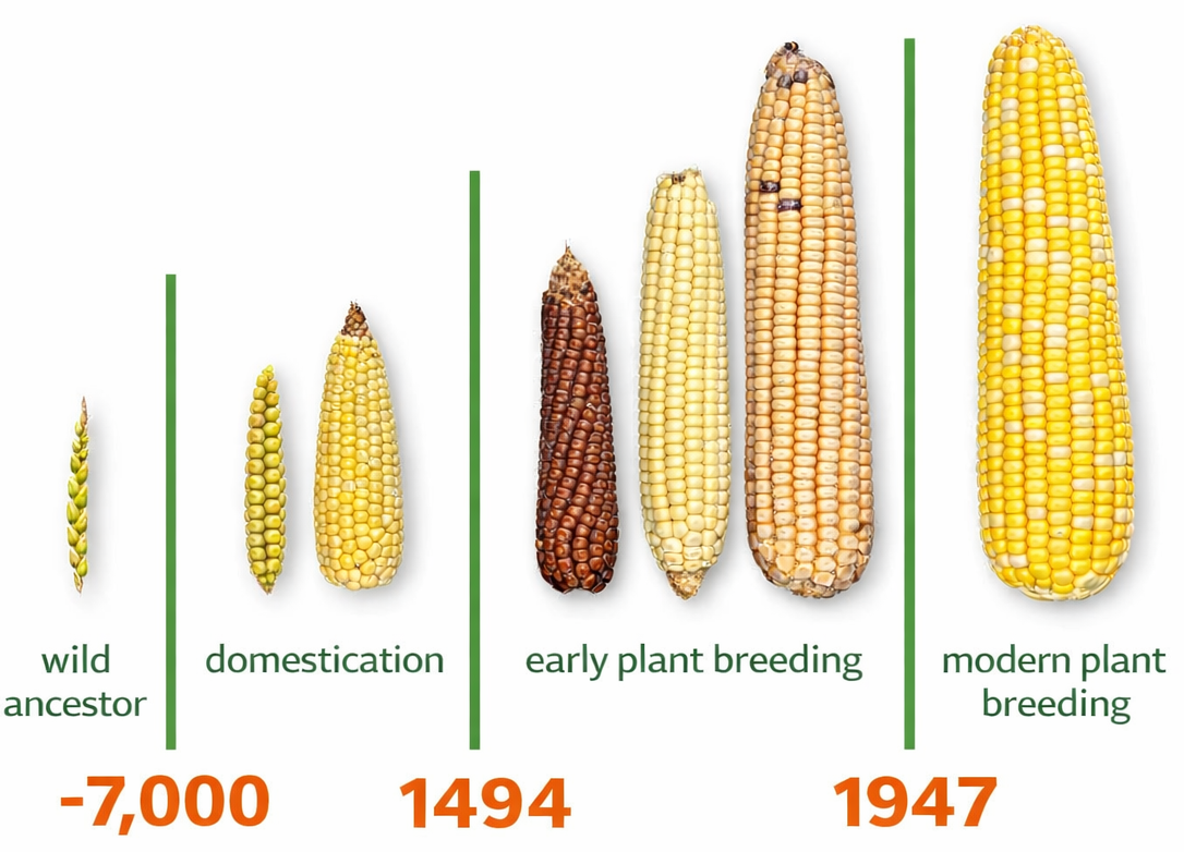 Molti elementi mobili trasportano siti riconosciuti da regolatori trascrizionali; la loro integrazione in prossimità di un gene può imporre un nuovo controllo trascrizionale e ridefinire reti regolative. Questi riassestamenti hanno avuto un ruolo rilevante nell’evoluzione delle piante domesticate. L’addomesticamento del mais a partire dal teosinte, per esempio, è stato favorito da poche variazioni genetiche di grande effetto, tra cui l’inserzione di un elemento mobile a monte di un gene implicato nello sviluppo del seme, che ha trasformato i piccoli semi duri del teosinte negli ampi chicchi del mais moderno (Figura 04.02-13).