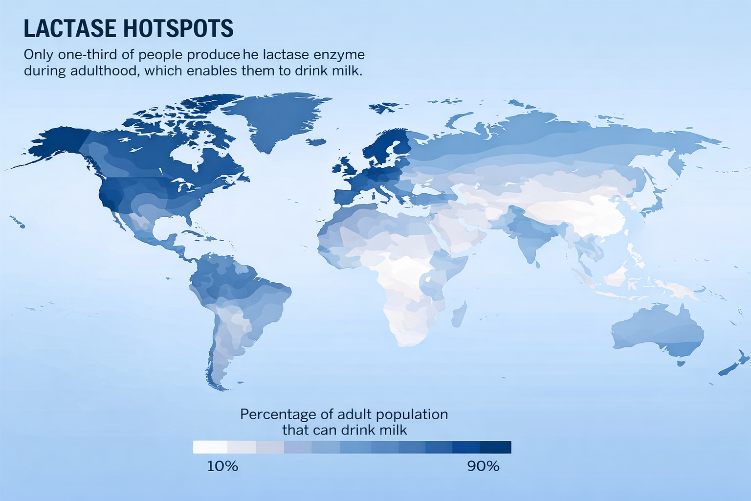 Un secondo caso emblematico è la persistenza della lattasi in età adulta. Nei gruppi umani antichi, l’enzima lattasi-florespina (LCT) veniva espresso prevalentemente durante l’infanzia; nelle popolazioni che, a partire da circa 10 000 anni fa, hanno praticato la pastorizia e consumato latte animale, si sono diffuse varianti regolative che mantengono elevata l’attività del gene LCT anche dopo lo svezzamento. Si tratta di mutazioni puntiformi localizzate in elementi enhancer all’interno del gene MCM6, che controllano a distanza la trascrizione di LCT. Tali varianti aumentano il reclutamento dei fattori trascrizionali nelle cellule dell’epitelio intestinale, sostenendo l’espressione della lattasi per tutta la vita. Dal punto di vista evolutivo, le persone adulte che digeriscono il lattosio rappresentano quindi “mutanti” regolativi rispetto ai loro antenati intolleranti, e la rapidità con cui questi alleli si sono diffusi in popolazioni ad alta dipendenza dai prodotti lattiero-caseari è notevole (Figura 04.02-05).