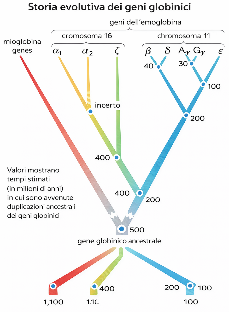 Duplicazioni successive hanno ampliato i cluster delle α- e delle β-globine in insiemi di geni con regolazione e caratteristiche funzionali differenziate. Mutazioni puntiformi che alterano le proprietà di legame all’ossigeno, insieme a variazioni nelle regioni regolative che modulano “quando” e “quanto” ciascun gene venga trascritto, hanno prodotto un repertorio di globine con profili di espressione stadio-specifici e differenti curve di saturazione. Accanto ai geni funzionali, i cluster ospitano numerosi pseudogeni, copie inattivate dall’accumulo di mutazioni deleterie, a testimonianza del fatto che molte duplicazioni non si traducono in nuove funzioni stabili. Sebbene qui si sia discusso il caso delle globine, percorsi analoghi hanno forgiato molte altre famiglie geniche del genoma umano.