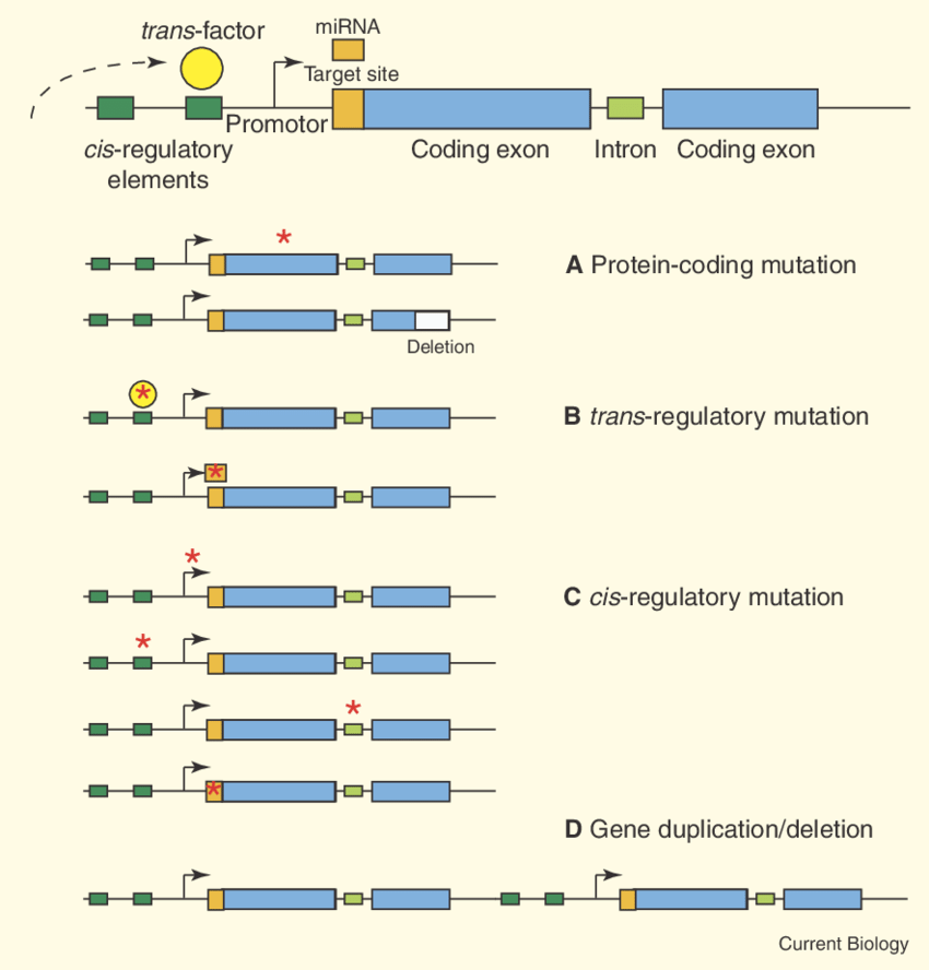 - variazioni nelle sequenze regolative: mutazioni in promotori, enhancer, silencer o insulator possono ridefinire tempi, livelli e sedi di espressione di un gene, con effetti fenotipici spesso rilevanti; molte differenze tra linee evolutive distanti, come pesci e umani, riflettono divergenze nella regolazione trascrizionale più che nel repertorio genico;