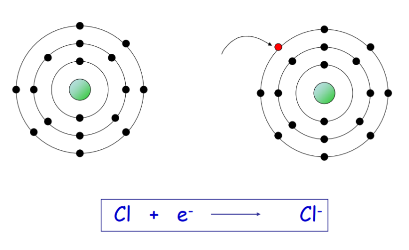 - affinità elettronica elevata, che favorisce l’acquisizione di un elettrone e la formazione di Cl−.