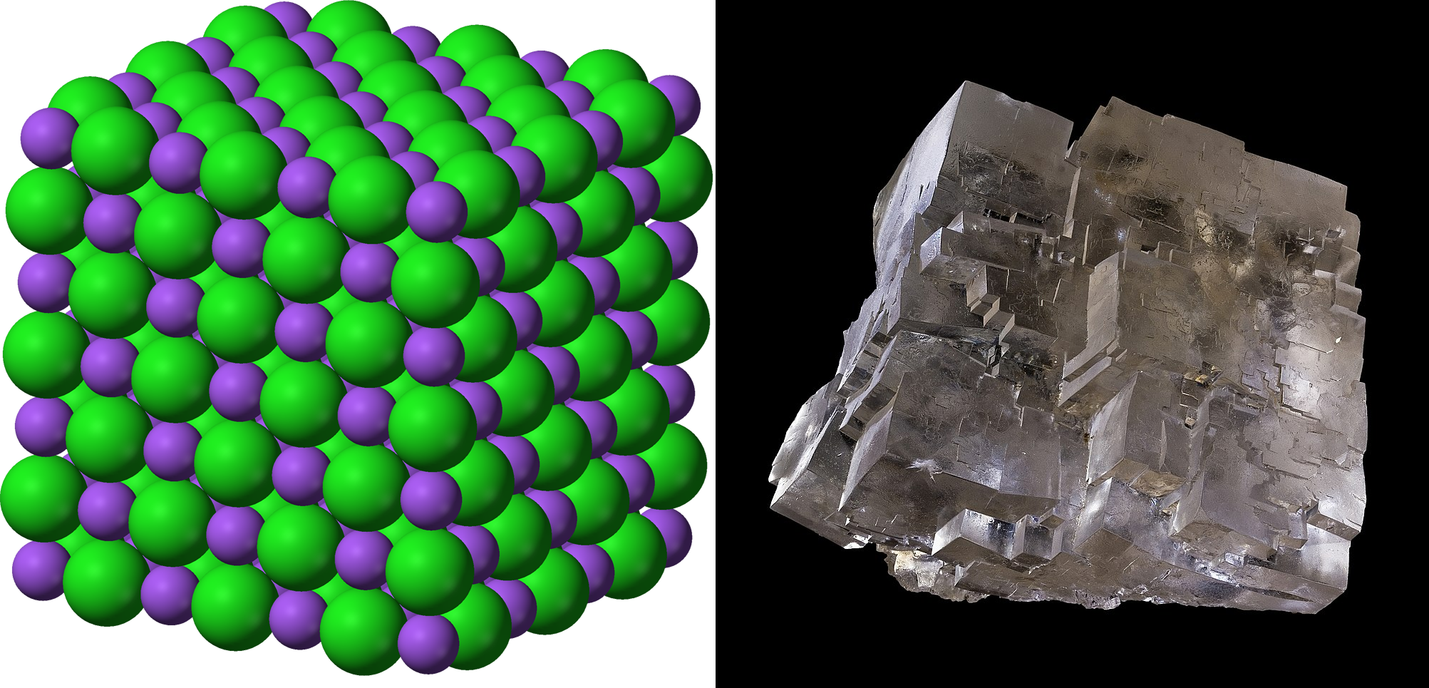 Nel solido cristallino non esistono “coppie ioniche” isolate: ciascun catione interagisce con più anioni e viceversa, dando origine a un reticolo cristallino tridimensionale periodico. Nel cloruro di sodio, la geometria del reticolo è mostrata in (Figura 01.13-02). L’energia reticolare, grandezza che misura la stabilità del solido ionico, è coerente con l’elevato punto di fusione e con la fragilità tipica dei cristalli ionici.