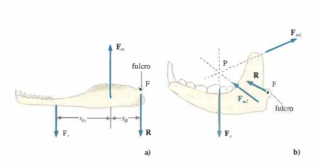 La mandibola del rettile si comporta quindi da leva di terzo genere, con guadagno meccanico G inferiore all’unità (leva svantaggiosa):