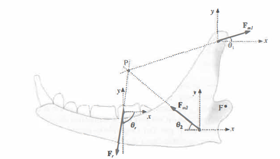 Nei mammiferi, la forza Fm1 agisce a un braccio più lungo e si aggiunge la risultante Fm2 di massetere e pterigoideo (Figura 02.21-01 ). Quando le linee d’azione di Fm1, Fm2 e Fr sono concorrenti, i loro momenti rispetto al punto d’incontro sono nulli; l’equilibrio dei momenti impone che anche la reazione vincolare R sia applicata lungo la stessa direzione. Se inoltre la somma vettoriale delle tre forze è nulla, si ha: