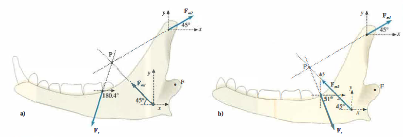 Nella (Figura 02.21-01) sono schematizzate due configurazioni tipiche della mandibola inferiore: nei rettili (a) la mandibola si comporta come una barra con il muscolo principale che esercita una forza Fm diretta superiormente e applicata vicino al fulcro F; nei mammiferi (b) è presente un pronunciato processo coronoideo per l’inserzione del muscolo temporale, che esercita una forza Fm1 diretta posteriormente e in alto, mentre i muscoli massetere e pterigoideo imprimono una forza Fm2 con componente anteriore e superiore. Consideriamo come tali configurazioni influenzino le condizioni di equilibrio e le sollecitazioni sull’articolazione durante il morso.
