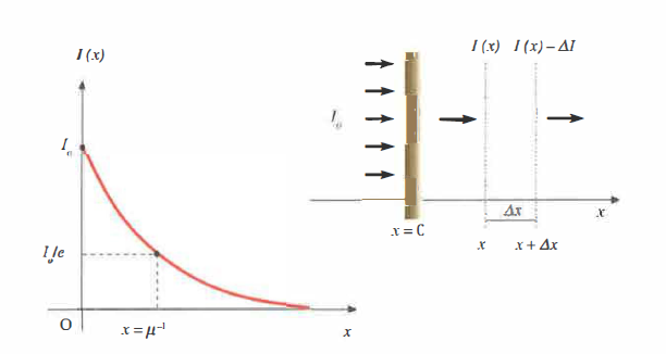 che, in notazione differenziale continua, si scrive \(-\frac{d I(x)}{d x} = \mu\, I(x)\). La soluzione fornisce una legge esponenziale decrescente dell’intensità con lo spessore attraversato (legge di attenuazione dei raggi X e γ, vedi (Figura 07.23-02):