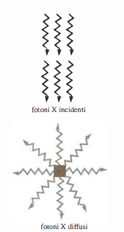 - diffusione elastica (Rayleigh), con deviazione angolare senza variazione di energia, in genere poco rilevante alle energie diagnostiche ma contributiva allo scattering complessivo;