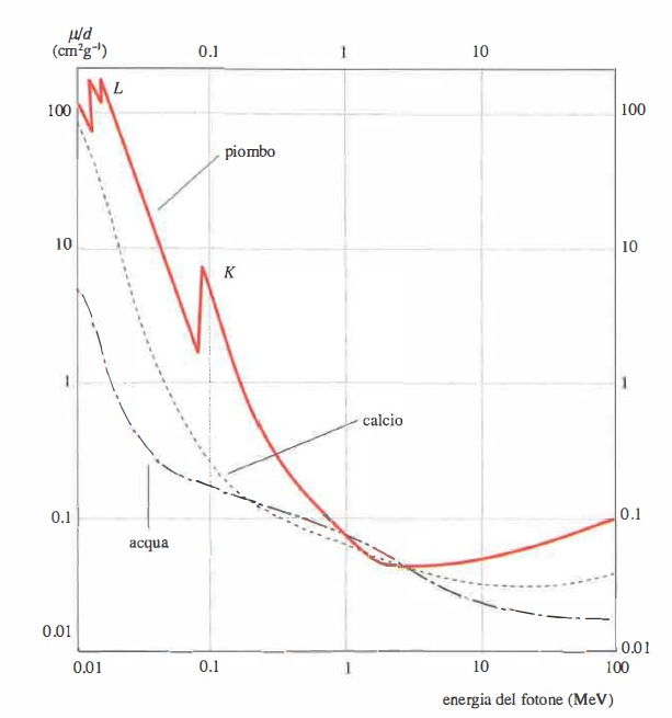 - effetto fotoelettrico, dominante a basse energie (in prima approssimazione 10–200 keV), con forte dipendenza da energia e numero atomico efficace \(Z_{\text{eff}}\) del materiale, approssimativamente \(\propto Z_{\text{eff}}^{n}/E^{3}\) con \(n \approx 3{-}4\);