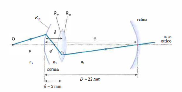 In queste espressioni \(n_1, n_2, n_3\) sono rispettivamente gli indici di rifrazione di aria (assunto 1), umor acqueo e cristallino; \(R_{12}\) è il raggio di curvatura della cornea, \(R_{23}\) quello della faccia anteriore del cristallino, \(R_{32}\) quello della faccia posteriore; \(q'\) è la distanza del piano immagine che si formerebbe in assenza del cristallino e \(\delta\) la distanza tra cornea e centro del cristallino (circa 5 mm). Il sistema definisce i punti coniugati dell’occhio.