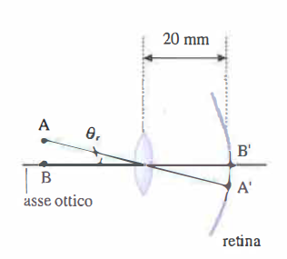 \[\text{sen} \, \theta_r = \frac{\overline{\text{A'B'}}}{20\text{mm}}, \quad \text{da cui} \quad \theta_r \approx 1' \approx 3 \cdot 10^{-4} \text{ radianti}.\]