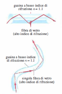 Le fibre ottiche sono guide d’onda flessibili, generalmente cilindriche e di diametro inferiore al millimetro, realizzate in silice (quarzo) altamente pura oppure in polimeri ingegneristici. La loro funzione è convogliare radiazione luminosa, e in configurazioni specifiche anche immagini, tra due punti lungo percorsi tortuosi, grazie al principio della riflessione totale interna. Quando un raggio luminoso incide sulla faccia d’ingresso con un’angolazione compresa entro il cosiddetto cono di accettazione, la rifrazione al confine aria–core porta l’angolo di incidenza sulla parete interna core–cladding a superare l’angolo critico, assicurando riflessioni totali e propagazione guidata fino all’estremità opposta (Figura 07.45-01). Per garantire tale condizione, il nucleo (core) è circondato da un rivestimento (cladding) con indice di rifrazione inferiore, cui si aggiungono di norma strati protettivi per la robustezza meccanica e la biocompatibilità.