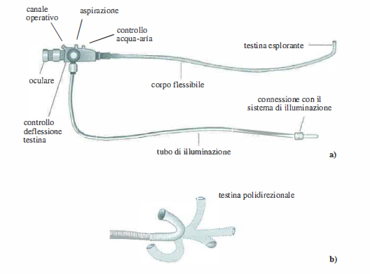Un impiego paradigmatico è l’endoscopia: sfruttando orifizi e cavità naturali, è possibile illuminare, visualizzare e documentare strutture interne altrimenti inaccessibili, mediante strumenti rigidi o flessibili (Figura 07.45-02). In termini funzionali, un endoscopio comprende: