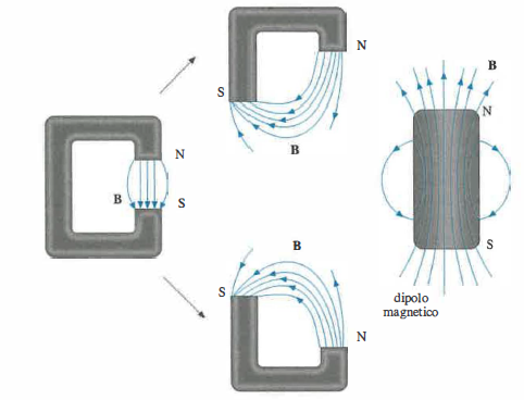 Infine, l’impossibilità di separare i poli nord e sud, già evidenziata dal fatto che le linee di \(\mathbf{B}\) sono chiuse, implica che spezzando un magnete si ottengono sempre dipoli magnetici più piccoli, mai monopoli isolati (Figura 07.04-03). Questa proprietà distingue radicalmente il magnetismo dall’elettrostatica, dove cariche isolate possono esistere e generare linee di campo aperte.
