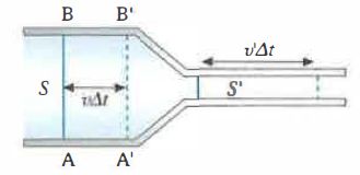Consideriamo un tratto di condotto di sezione S nel quale la velocità ha modulo uniforme v e direzione perpendicolare alla sezione. Le particelle che si trovano inizialmente sul piano AB (Figura 03.03-02) si spostano, in un intervallo di tempo Δt, di una distanza vΔt; il prisma fluido compreso tra i piani AB e A′B′ possiede volume V = S v Δt. Per definizione, la portata risulta quindi: