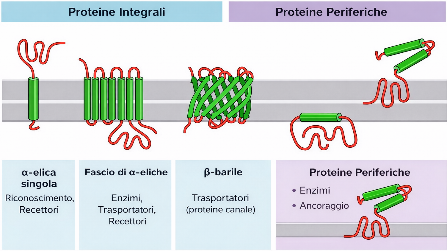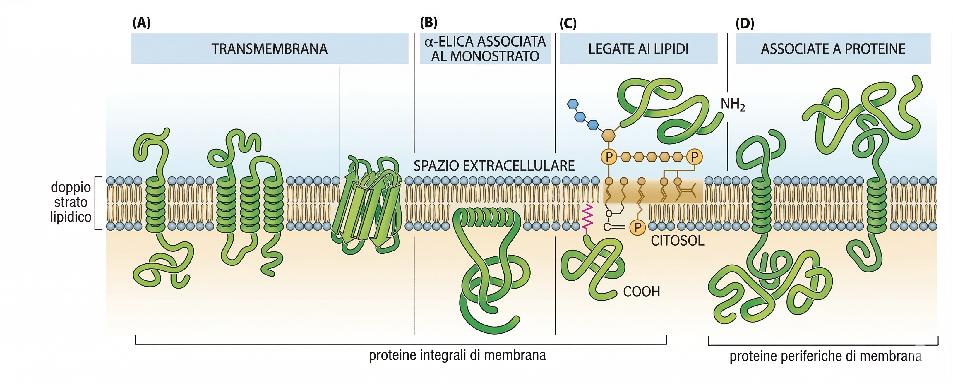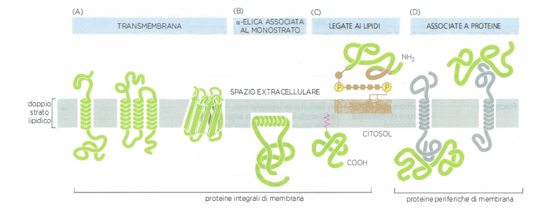 Le proteine si associano alla membrana per mezzo di soluzioni strutturali differenti, tutte fondate sul principio dell’amfipatia: segmenti idrofobi si dispongono nella regione apolare del doppio strato, mentre domini idrofili si affacciano sui compartimenti acquosi su uno o entrambi i lati della membrana:
