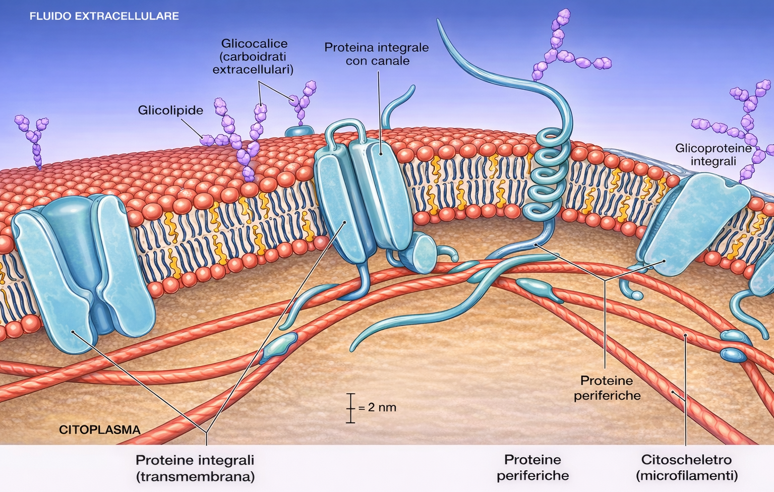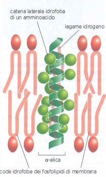 - Numerose proteine attraversano il doppio strato una o più volte, sporgendo su entrambi i versanti della membrana (Figura 05.02-01); i segmenti transmembrana sono in genere α-eliche idrofobiche di 20–25 residui, compatibili con lo spessore della regione idrofoba (circa 3,0–3,5 nm), oppure, in specifici contesti di membrana esterna batterica e di organelli, barili β; le porzioni idrofile formano anse o domini esposti al citosol e allo spazio extracellulare;