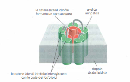 Molte proteine transmembrana attraversano il doppio strato una sola volta (Figura 05.02-01). In tale classe rientrano frequentemente recettori per segnali extracellulari o proteine di adesione. Al contrario, i canali e numerosi trasportatori richiedono più segmenti transmembrana per comporre pori idrofili o siti di legame e translocazione attraverso la membrana; per questo le proteine che la attraversano ripetutamente utilizzano un fascio di α-eliche (Figura 05.02-01). In molte proteine multipasso, porzioni delle eliche sono anfipatiche: i residui apolari occupano un versante, rivolto verso i lipidi, mentre i residui polari o carichi si allineano sul versante opposto. In ambiente membranario, tali eliche anfipatiche si associano lateralmente formando un anello nel quale le superfici apolari si affacciano ai lipidi, e le superfici polari delimitano un poro acquoso continuo (Figura 05.02-04). La disposizione delle catene laterali e la geometria del fascio modulano selettività e gating del poro.