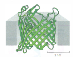 Sebbene l’α-elica sia la conformazione dominante per i segmenti transmembrana, alcune proteine adottano una strategia alternativa basata su foglietti β, che si arrotolano in un cilindro β (o barile β) (Figura 05.02-01). In questi assemblaggi, le catene laterali orientate verso il lume del cilindro tendono a essere polari e definiscono il canale idrofilo, mentre quelle esposte alla matrice lipidica sono apolari. Le porine costituiscono un esempio paradigmatico: esse formano ampi pori idratati nelle membrane esterne batteriche e mitocondriali, consentendo il passaggio controllato di nutrienti, metaboliti e ioni inorganici attraverso la membrana esterna, pur limitando l’ingresso di molecole di dimensioni maggiori (Figura 05.02-05). La regolazione della permeabilità dipende da dimensioni del poro, cariche distribuite all’interno del lume e loop esterni che possono parzialmente occludere il canale.
