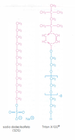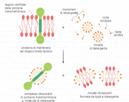 Lo studio biochimico e strutturale delle proteine di membrana richiede la loro estrazione in forma nativa da un ambiente fortemente anisotropo, in parte acquoso e in parte lipidico. Poiché la maggior parte delle metodiche analitiche opera in soluzione acquosa, il passo iniziale per isolare tali proteine prevede la disgregazione controllata del doppio strato lipidico e la stabilizzazione della superficie idrofoba della proteina una volta esposta all’acqua. A questo scopo si impiegano detergenti, piccole molecole anfipatiche con una singola coda idrofoba, la cui geometria conica favorisce in acqua la formazione di micelle e non di doppi strati (Figura 05.02-06). Al di sopra della concentrazione micellare critica (CMC), i detergenti auto-assemblano micelle che possono inglobare segmenti idrofobi di lipidi e proteine.