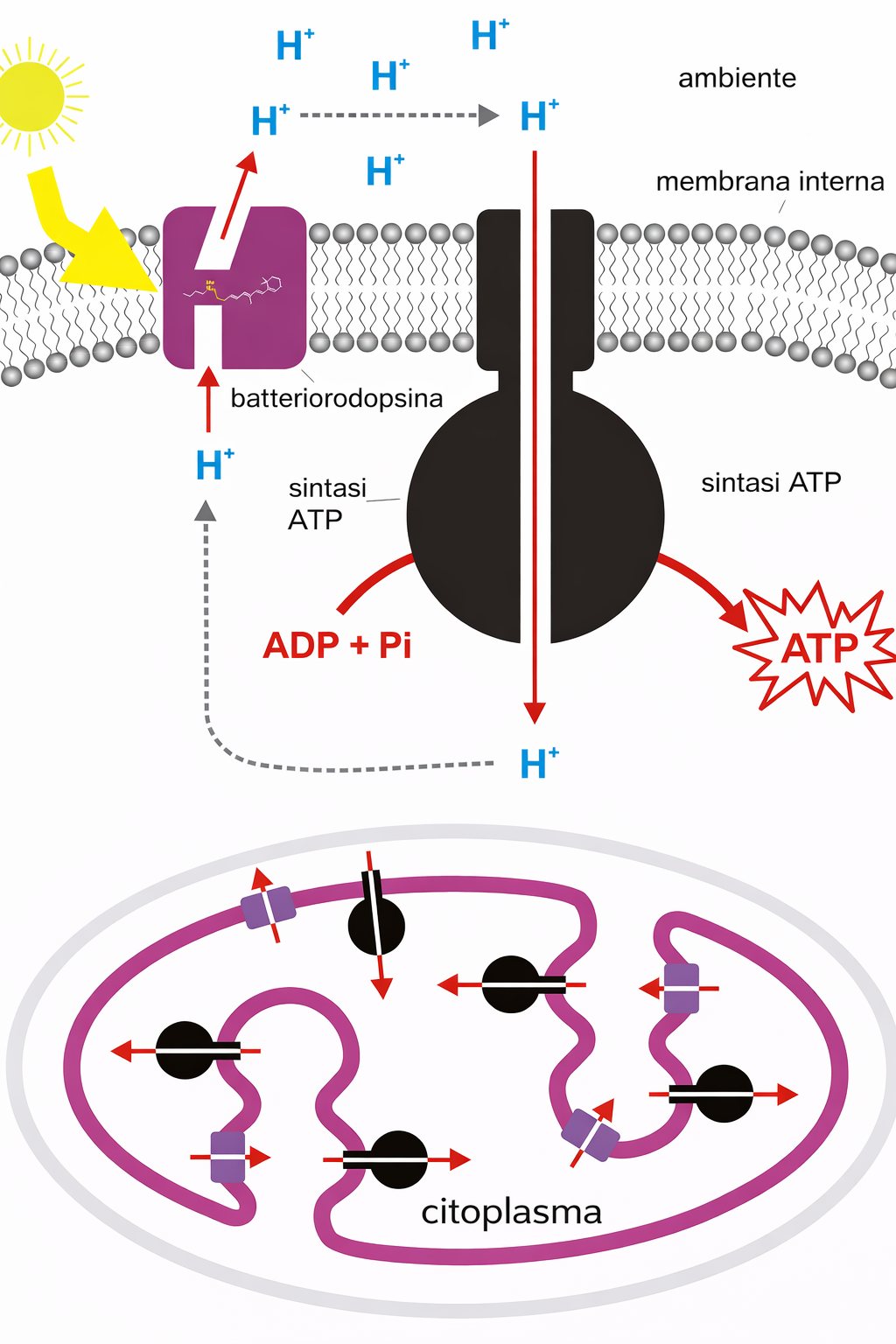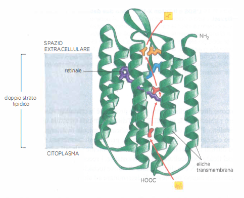 Un caso emblematico è la batteriorodopsina, abbondante nella membrana di Halobacterium salinarum (già Halobacterium halobium), un archeo alofilo. La sua architettura ha chiarito con precisione come una α-elica attraversi il doppio strato lipidico: la proteina possiede sette segmenti transmembrana elicoidali e una cromoforo non proteico, il retinale, legato covalentemente tramite una base di Schiff a una lisina di una delle eliche. La batteriorodopsina funziona come pompa protonica che trasferisce ioni H⁺ verso l’esterno sfruttando l’energia luminosa assorbita dal retinale. L’isomerizzazione fotoindotta del retinale avvia una sequenza ordinata di micro-rilassamenti conformazionali nelle eliche immerse nella membrana, i quali portano al rilascio vettoriale di un protone all’esterno e al reset del sito di legame interno (Figura 05.02-08). L’azione concertata di migliaia di molecole, in presenza di luce, genera un gradiente protonico transmembrana che viene in seguito convertito in energia chimica sotto forma di ATP. In termini funzionali, la batteriorodopsina rientra tra le proteine trasportatrici che spostano selettivamente ioni e piccole molecole attraverso la membrana (Figura 05.02-17), costituendo un paradigma per comprendere come le proteine transmembrana accoppino cambiamenti conformazionali a flussi ionici direzionali.