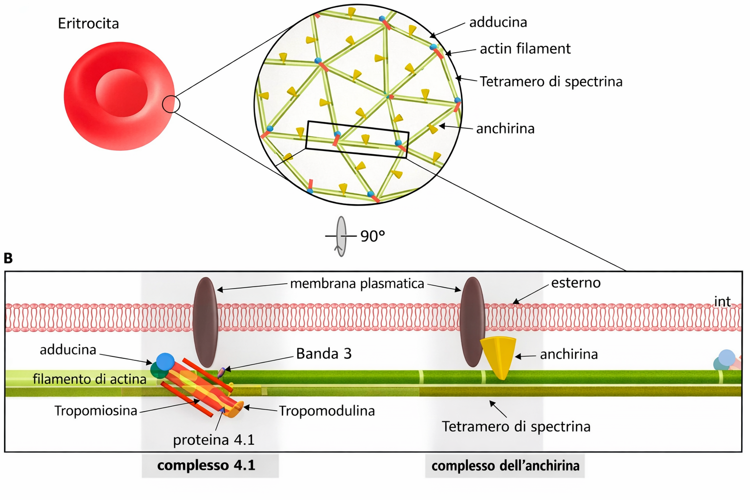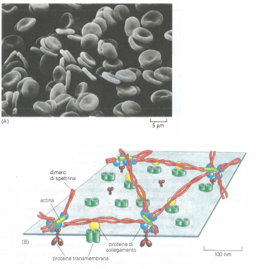 Nell’ambiente vegetale, fungino e batterico, la resistenza è assicurata prevalentemente da una parete cellulare esterna, rigida e fibrosa, formata da polisaccaridi e proteine che avvolgono la membrana. Nelle cellule animali, prive di parete, la membrana è sostenuta dal cortex (o reticolo corticale), una rete di proteine fibrose adesa alla faccia citoplasmatica della membrana plasmatica. Il cortex degli eritrociti umani, oggetto di studi approfonditi, mostra un’organizzazione regolare e relativamente semplice. Queste cellule, di forma biconcava (Figura 05.02-09), dipendono da un reticolo a maglie formato principalmente da spettrina, una proteina dimerica allungata e flessibile (lunghezza di circa 100 nm), organizzata in filamenti che si interconnettono con brevi filamenti di actina. Il reticolo è vincolato alla membrana tramite proteine adattatrici intracellulari (come ankyrina e proteina 4.1R) che collegano la spettrina a specifiche proteine transmembrana, tra cui il canale banda 3 e la glicoforina (Figura 05.02-09).