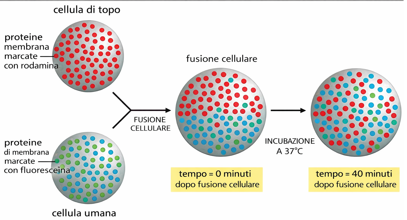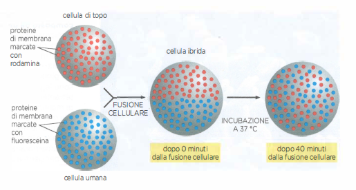 Il doppio strato lipidico si comporta come un fluido bidimensionale in cui lipidi e molte proteine diffondono lateralmente. La mobilità laterale delle proteine fu evidenziata in esperimenti di fusione tra cellule umane e murine: inizialmente i marcatori proteici specifici di ciascuna cellula rimangono segregati, ma nel giro di decine di minuti si mescolano fino a uniformarsi sulla superficie della cellula ibrida (Figura 05.02-10). Tecniche come FRAP (fluorescence recovery after photobleaching) hanno confermato la natura dinamica della membrana, misurando coefficienti di diffusione e frazioni mobili.