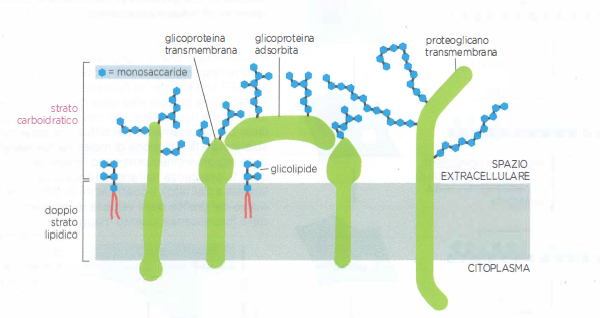 - idratazione e lubrificazione: le catene glucidiche idrofile trattengono acqua e rendono la superficie scivolosa, facilitando, ad esempio, il passaggio di cellule ematiche in microvasi stretti;