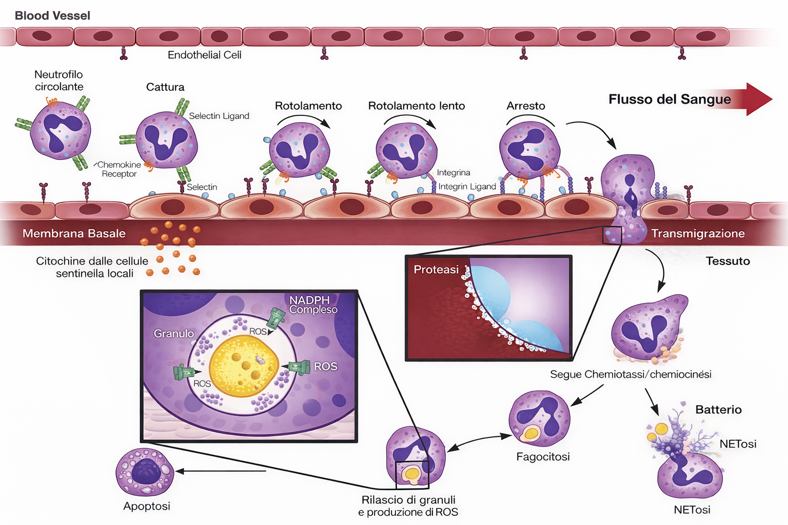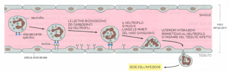 Tali interazioni governano processi biologici chiave. Nel riconoscimento gametico, determinanti oligosaccaridici della zona pellucida e della membrana dello spermatozoo mediano l’adesione iniziale. Durante le prime fasi della risposta infiammatoria, i neutrofili esprimono carboidrati superficiali che sono selettivamente riconosciuti da lectine (come le selectine) espresse dall’endotelio dei vasi nella regione infetta: il legame transitorio consente il rotolamento, seguito da adesione salda e diapedesi verso il tessuto interessato (Figura 05.02-14). Insieme, questi esempi illustrano come il glicocalice integri protezione fisica e comunicazione molecolare, orchestrando il comportamento collettivo delle cellule nei tessuti.